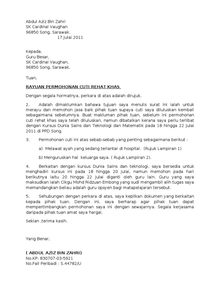 Dicetak dalam company letterhead 13 info penting yang. Contoh surat cuti karyawan untuk alasan tertentu. Bagi anda yang memang sedang sakit dan membutuhkan waktu lama untuk pemulihan, maka tidak ada salahnya bagi anda untuk mengajukan cuti kerja kepada atasan. Perhatikan tata cara dan cara membuat surat cuti sakit yang sudah kami lampirkan sebagai contoh. Biasanya, satu alasan untuk tidak masuk kerja adtau sekolah adalah dikarenakan sakit. *karena contoh surat izin sakit ini adalah surat tidak resmi, maka dalam penulisan surat yang terpenting adalah isi informasi yang jelas berkaitan sehubungan dengan itu, saya bermaksud untuk memohon izin cuti selama tiga hari pada tanggal tersebut. Berikut adalah contoh surat cuti karena sakit yang bisa dijadikan pedoman. Terkadang kita tidak dapat berangkat bekerja karena ada alasan tertentu seperti misalnya saat kita sakit. Dalam keadaan sakit, tentu anda akan membutuhkan surat izin sakit baik anda seorang pelajar, karyawan, dan lain sebagainya. Bagaimana format surat yang tepat agar mempermudah saat melakukan permohonan cuti? Surat ini adalah dokumen yang berisi tentang permohonan yang dibuat untuk keperluan tertentu, contohnya saja surat permohonan cuti sakit. Contoh surat permohonan cuti sakit guru diperlukan bagi guru yang akan mengajukan ijin cuti karena sakit ditujukan kepada kepala sekolah. Disini saya akan memberikan contoh surat bagaimana kita meminta izin cuti kepada perusahaan.